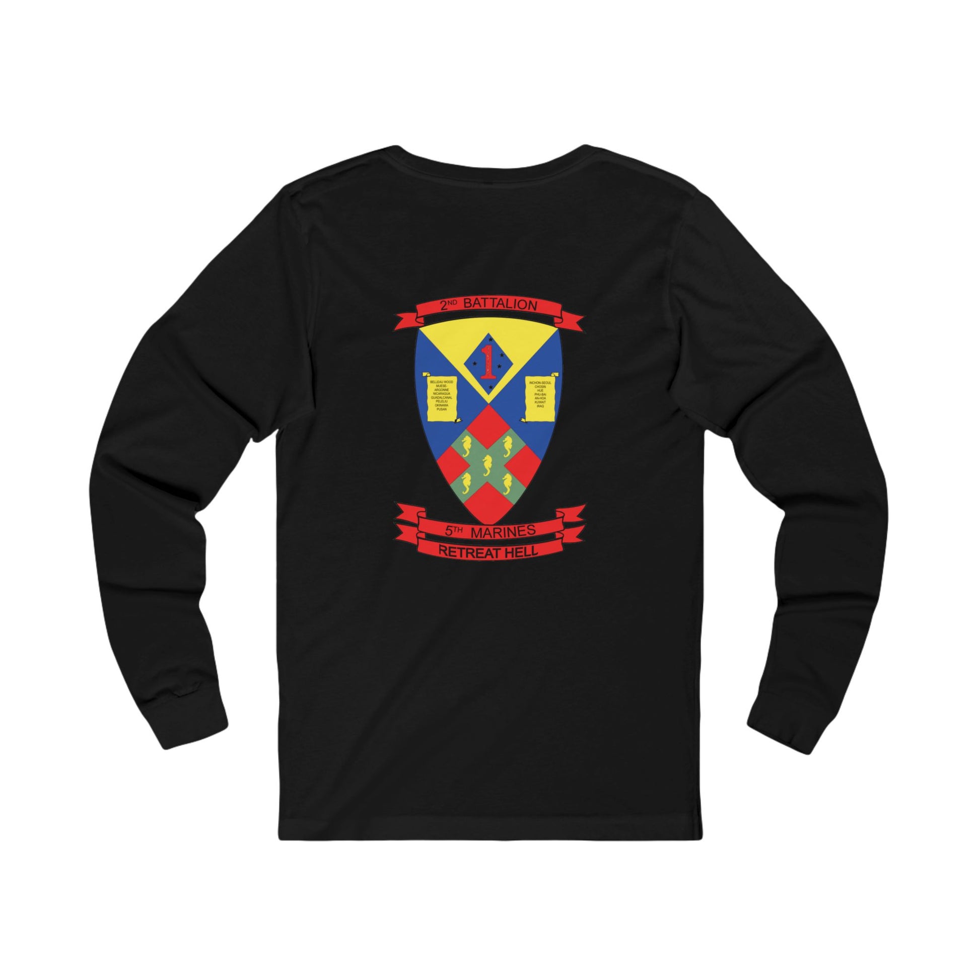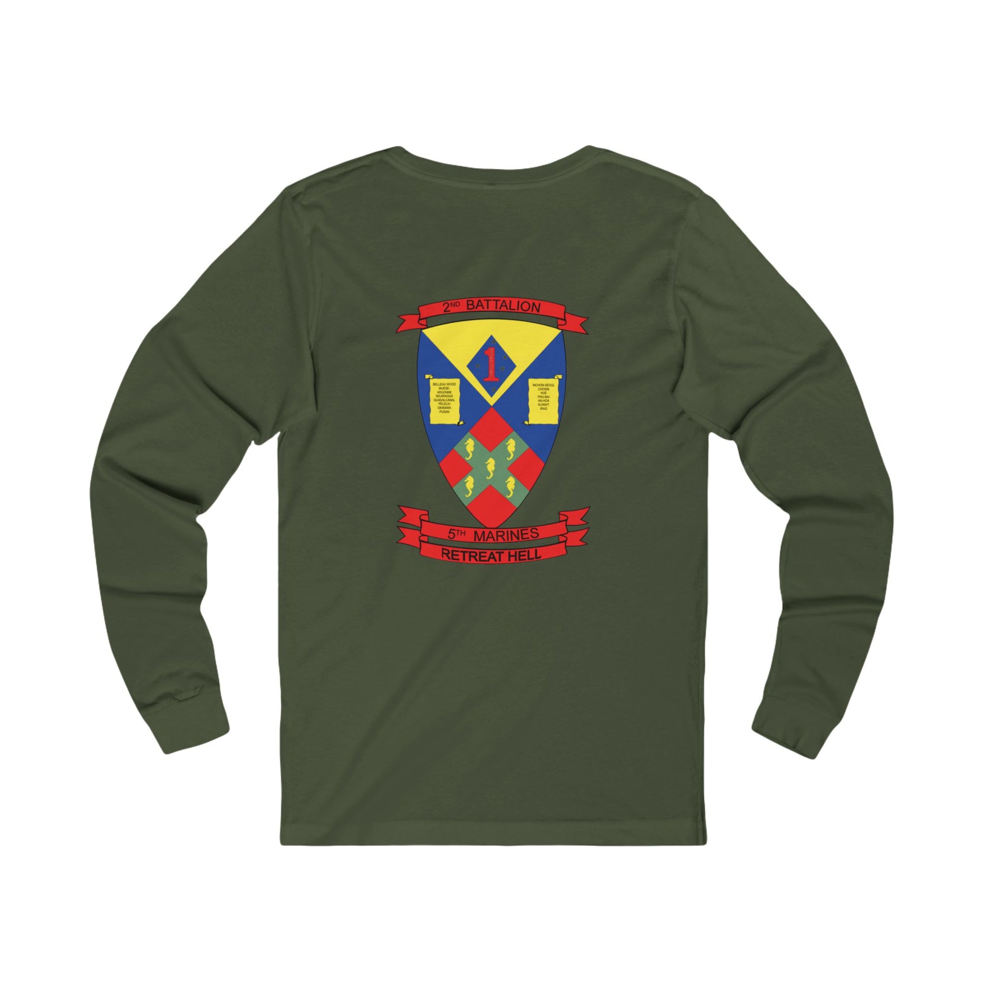 Stay warm during PT at zero-dark thirty when you're cold and sad with this classic long sleeve skivvie shirt. Available in olive drab green and black; features the 1st MARDIV blue diamond logo on the front, 2d Battalion, 5th Marines logo on the back, callsign "Bloodline". Retreat, Hell!