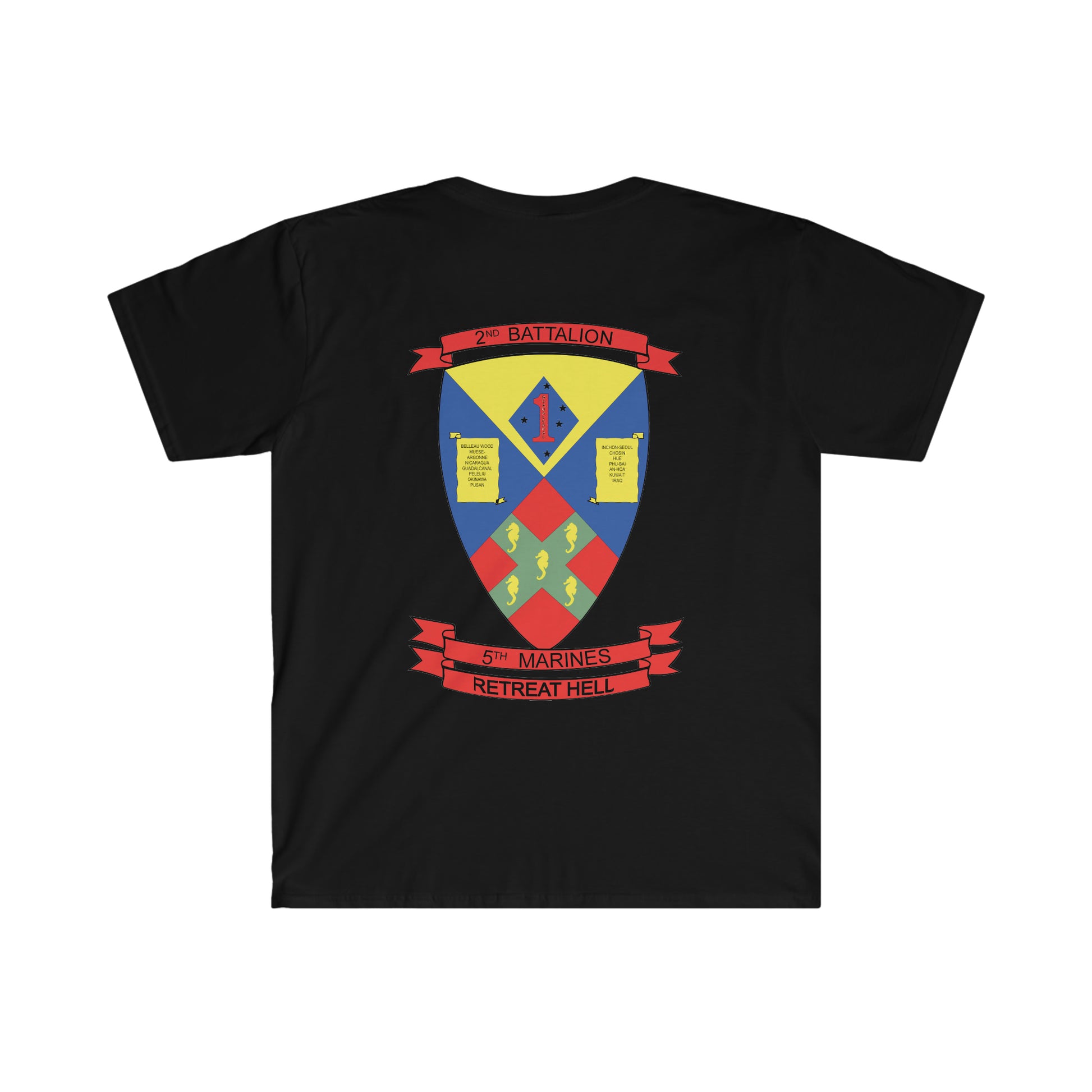 Rep your unit with this classic skivvie shirt. Available in olive drab green and black. Features 1st MARDIV blue diamond logo on the front, 2d Battalion, 5th Marines logo on the back, callsign "Bloodline". Retreat, Hell!
